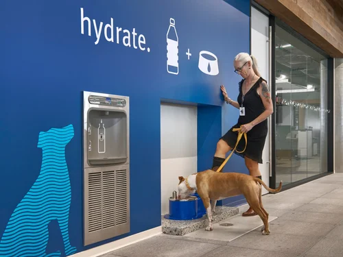 As a provider of veterinary services, it’s no surprise that Banfield is passionate about pets—they even encourage employees to bring their dogs and cats to work! Our brand team was hired to bring that passion to life in their new headquarters. We worked closely with the interior design team to integrate graphics into the environment—from mission and vision wall visuals, to playful installations like pet hydration stations that add character to the space. The multi-story dog ramp features glass railings treated with silhouettes of animals in motion on one side and playful text on the other. We also designed a signage system with colored zones to help employees and visitors navigate the large headquarters and created customizable signage at department entries to support the sense of community Banfield wanted to nurture.